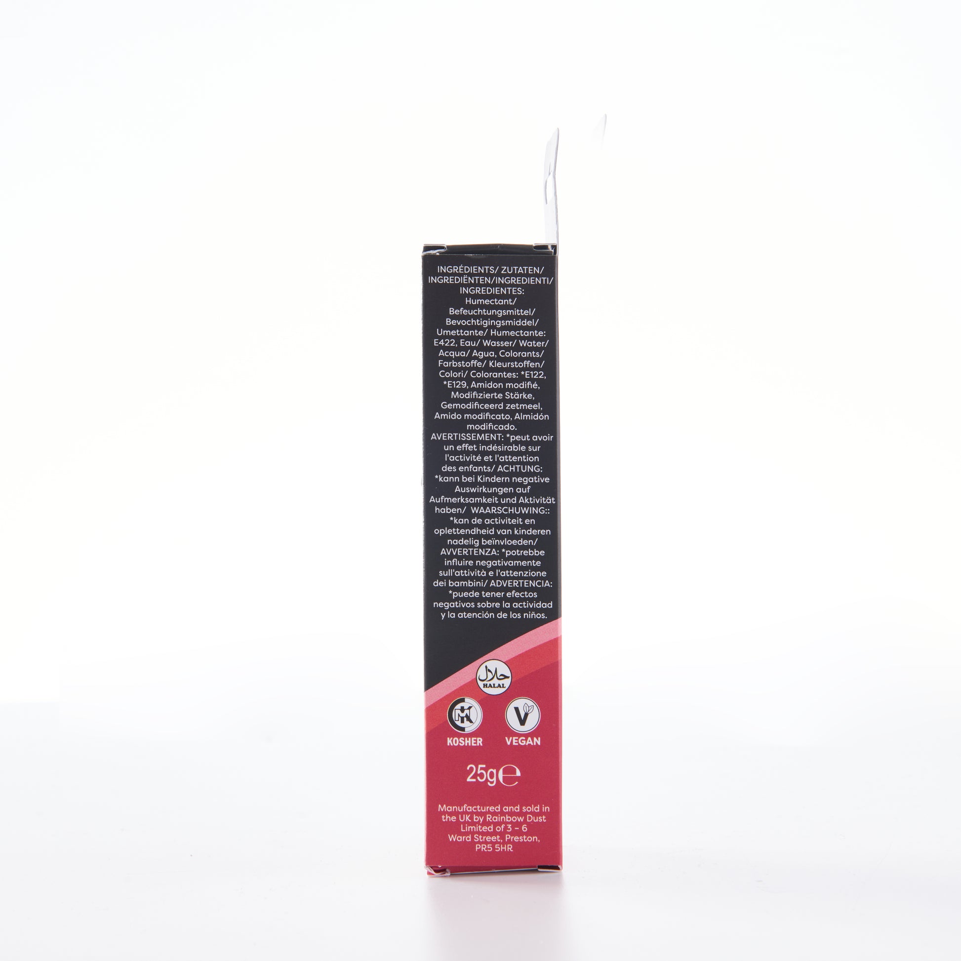 Zutaten: Feuchthaltemittel: E422, Wasser, Farben: *E122, *E129, modifizierte Stärke (Tapioka). Warnung: *E122, *E129 können die Aktivität und Aufmerksamkeit von Kindern beeinträchtigen.