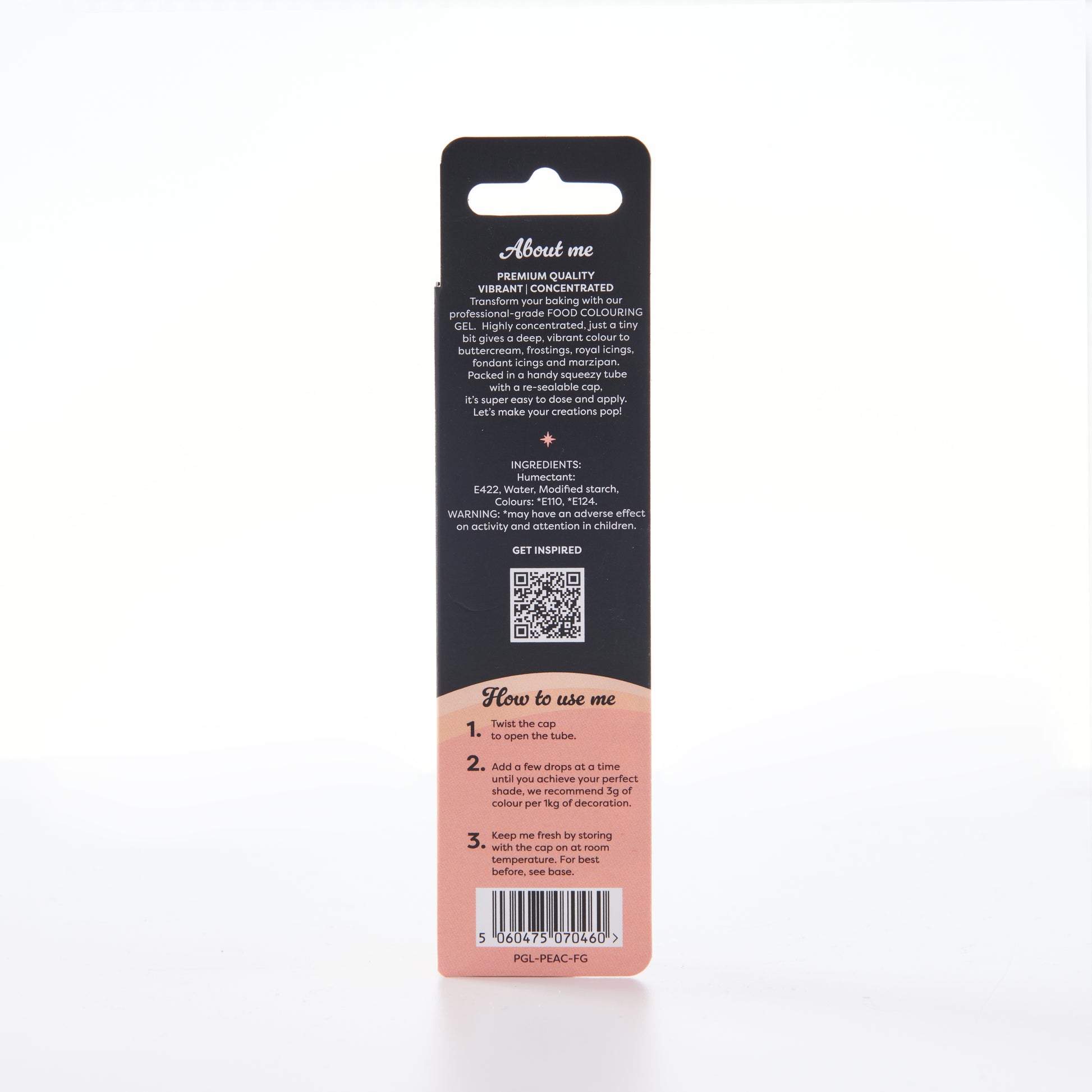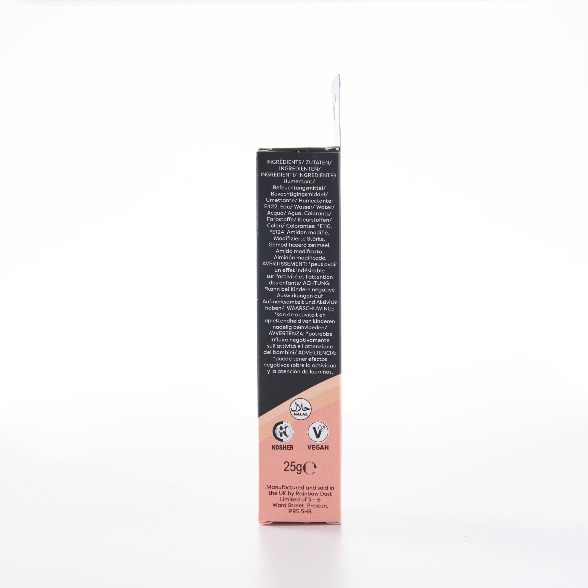 Zutaten: Feuchthaltemittel: E422, Wasser, modifizierte Stärke (Tapioka), Farben: *E110, *E124. Warnung: *E110, *E124 können die Aktivität und Aufmerksamkeit von Kindern beeinträchtigen.